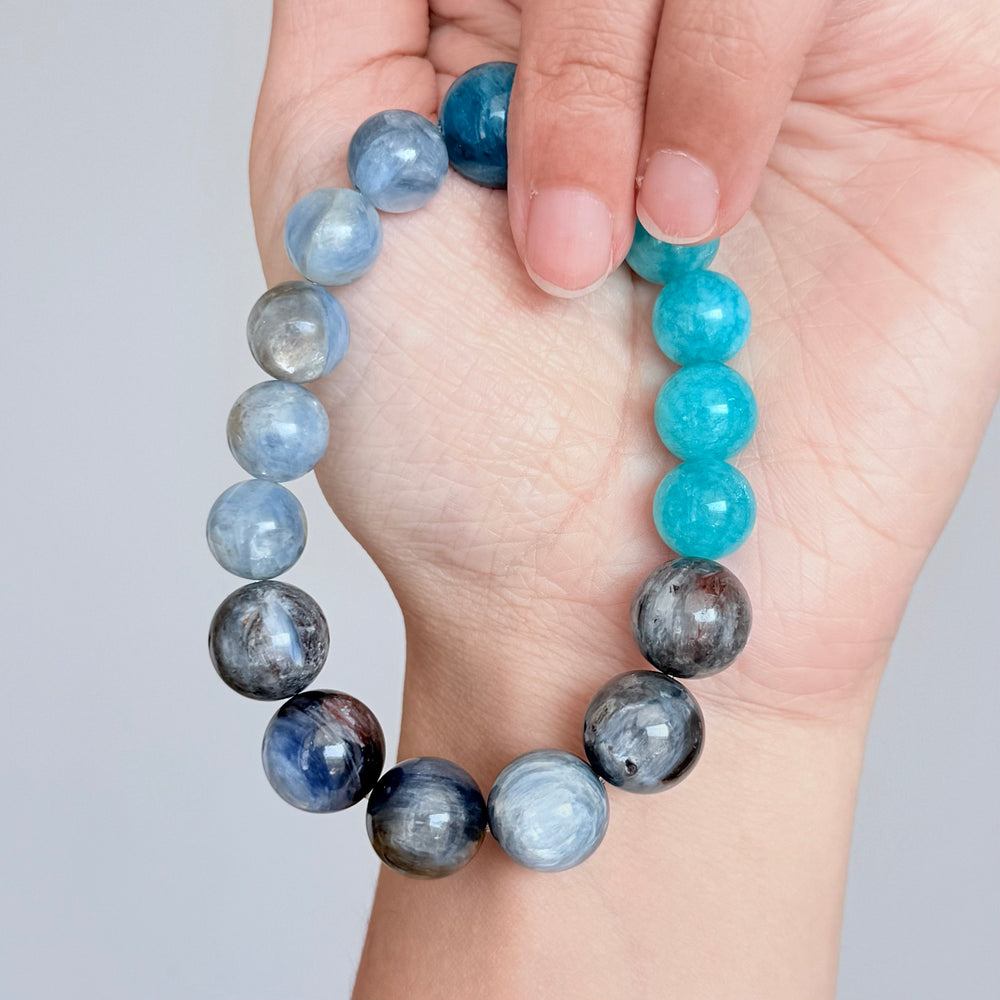 This bracelet features the mesmerizing deep navy hues of Sodalite paired with the bright, ocean-like tones of Blue Apatite, symbolizing clarity, truth, and emotional balance. Each bead is hand-selected and polished to a smooth shine, creating a stunning visual gradient that flows from light aqua to midnight blue.