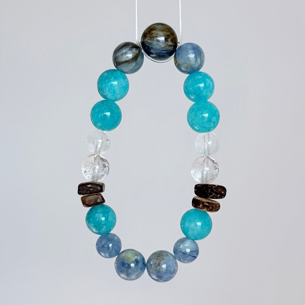 Find your inner voice and embrace tranquility with this Blue Kyanite & Amazonite Bracelet, delicately accented with Clear Quartz and Smoky Quartz. Designed for those seeking emotional clarity, peaceful communication, and energetic protection, this bracelet brings harmony between the mind and the heart.