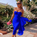 Add a gorgeous gloss to your next special soirée in an off-the-shoulder satin dress scattered with blooms and shaped to define the waist.