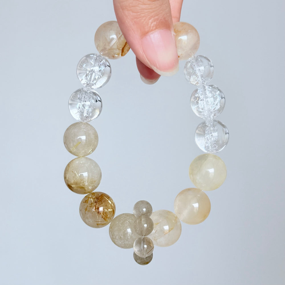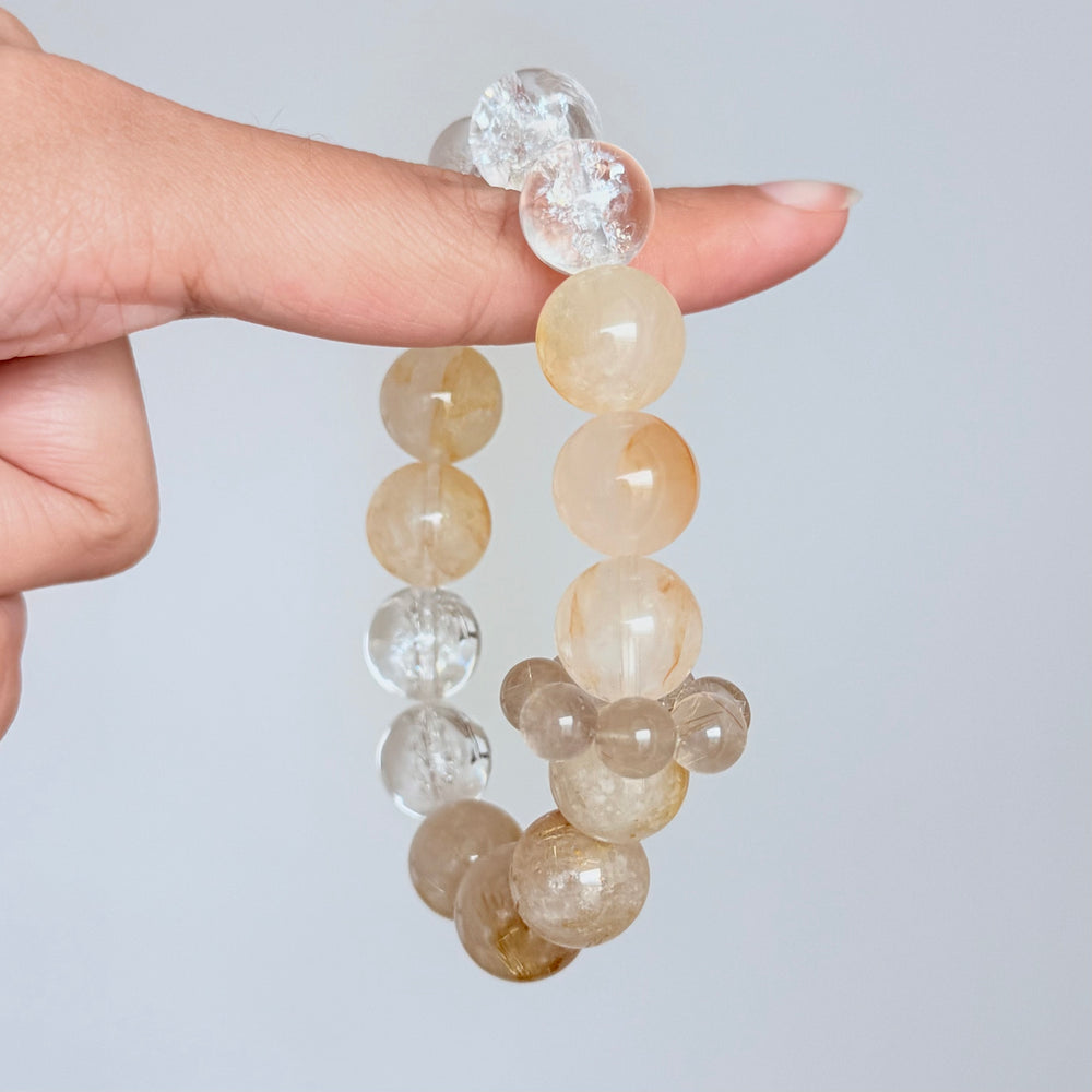 Bring radiant confidence and abundance into your life with this Golden Rutilated Quartz Bracelet, elegantly accented with Clear Quartz and Smoky Quartz beads. This luxurious crystal combination balances high vibration energy with grounded stability, creating a powerful harmony between wealth and inner peace.