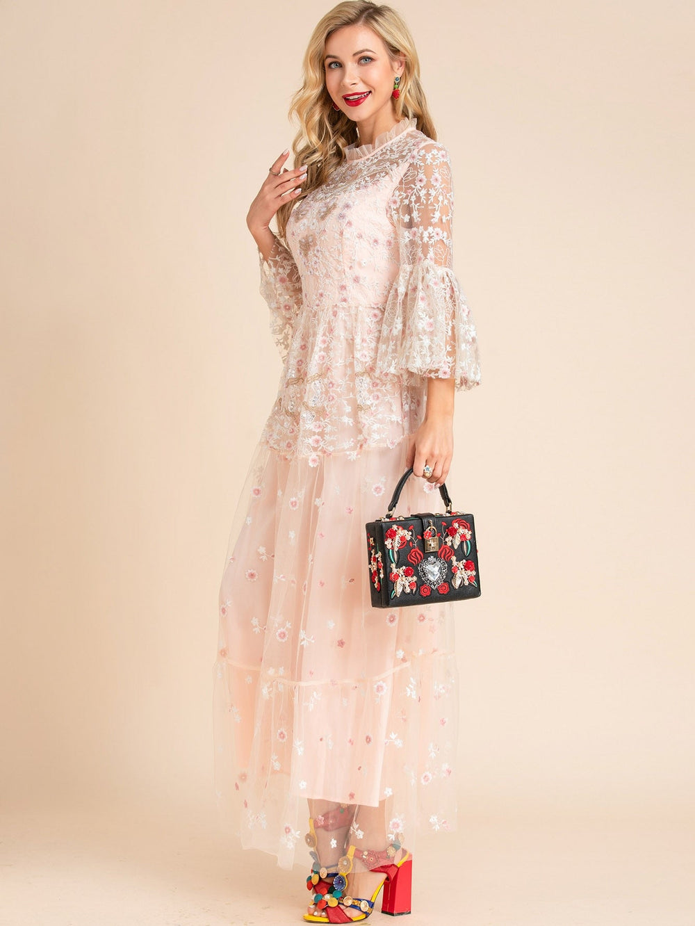 Its intricate mesh embroidery style is sure to turn heads and wow guests. Its flattering silhouette and comfortable fit ensures hours of comfortable wear. With this dress. you'll be the star of any special event.