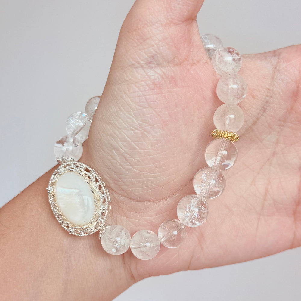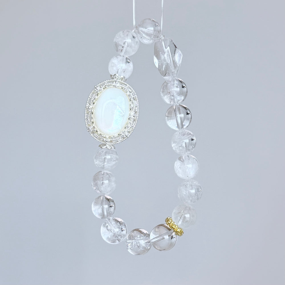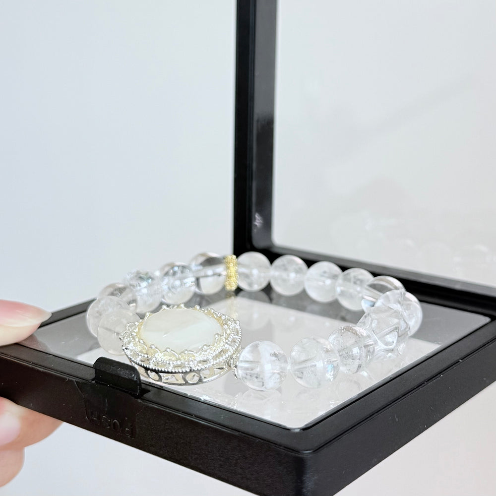 Featuring a luminous oval moonstone centerpiece, encircled by delicate rhinestones, this bracelet radiates a soft, ethereal glow. The clear quartz beads are carefully polished to enhance energy flow, clarity, and emotional healing β making this bracelet both a beautiful accessory and a source of daily positive energy.
