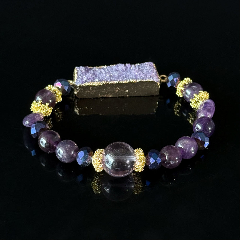Amethyst Druzy is known for its strong cleansing energy, helping to absorb negative vibrations and elevate spiritual awareness. Amethyst enhances intuition and emotional control, while Clear Quartz amplifies energy and intention. Gold-tone accents add a touch of luxury and symbolize inner strength and confidence