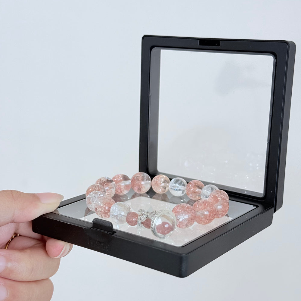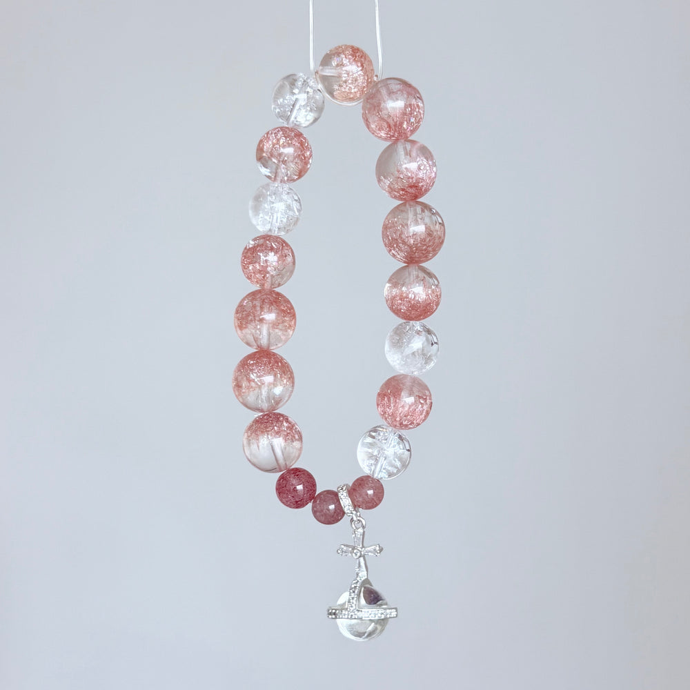 Elevate your energy and style with this stunning Strawberry Quartz and Clear Quartz Bracelet, beautifully accented with a silver planet charm symbolizing balance, connection, and cosmic harmony.